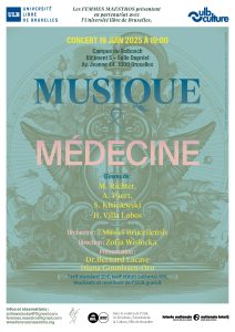 L’association Femmes Maestros, en collaboration avec l’Université libre de Bruxelles, présente le concert « Musique & Médecine ». Ce concert se tiendra avec la participation de l’orchestre I Musici Brucellensis et la présence du Dr Bernard Lacave, qui exposera l’impact que la pratique d’un instrument de musique peut avoir sur le corps.